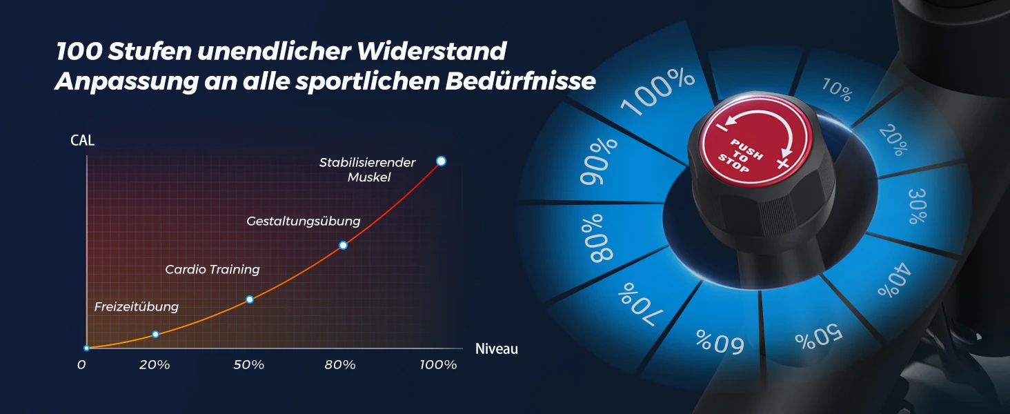 Genießen Sie den unbegrenzt einstellbaren Widerstand durch müheloses Drehen des Knopfes, um den unterschiedlichen Trainingsanforderungen gerecht zu werden. Für zusätzliche Sicherheit sorgt die Notbremsfunktion für ein sofortiges Anhalten und damit für ein beruhigendes Gefühl während Ihrer Indoor-Cycling-Sessions.